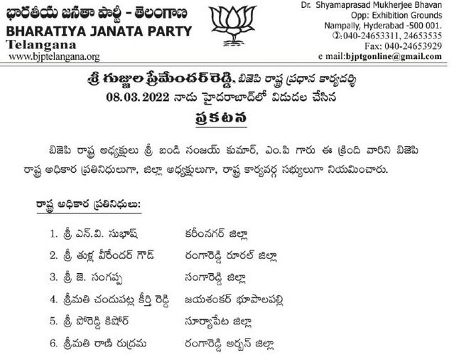 इसके साथ ही तेलंगाना के कार्यकारिणी के सदस्य और जिला अध्यक्षों को भी नियुक्त किया है। भाजपा के प्रदेश महासचिव गुज्जुला प्रेमेंद्र रेड्डी ने इस आशय का एक बयान जारी किया है।