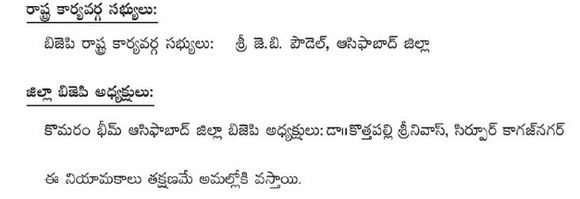 कोमुराम भीम आसिफाबाद जिले के लिए पार्टी के नये अध्यक्ष के रूप में सिरपुर कागजनगर निवासी कोत्तापल्ली श्रीनिवास को नियुक्त किया है। हालांकि वर्तमान अध्यक्ष जेबी पौडेल को तेलंगाना के कार्यकारी सदस्य बनाया है। यह नियुक्ति तुरंत लागू होगी।
