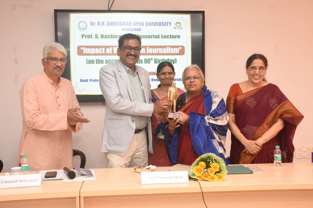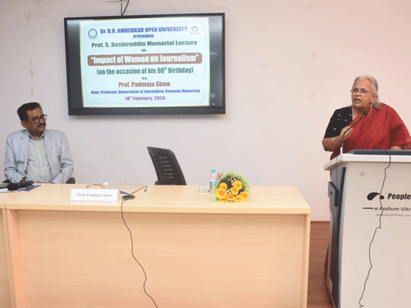 హైదరాబాద్ : భారతదేశంలో నేడు మహిళా జర్నలిస్టులు చట్టపరమైన బెదిరింపులు, వృత్తిపరమైన ఒంటరితనం మరియు నిరంతర ఆన్‌లైన్ ట్రోలింగ్ రూపంలో వేధింపులను తప్పడం లేదని ప్రొ. పద్మజా షా ఆవేదన వ్యక్త పర్చారు. ప్రపంచ వ్యాప్తంగా గుర్తింపు పొందిన ప్రఖ్యాత పాత్రికేయులు, అంబేద్కర్ ఓపెన్ యూనివర్సిటీ మాజీ వీసీ ప్రొ. యస్. బషీరుద్దీన్ 90వ జయంతిని పురస్కరించుకుని అంబేద్కర్ సార్వత్రిక విశ్వవిద్యాలయంలో స్మారకోపన్యాసం నిర్వహించారు. ఈ కార్యక్రమానికి ముఖ్య అతిథిగా ఉస్మానియా విశ్వవిద్యాలయ జర్నలిజం విభాగ రిటైర్డ్ అధ్యాపకురాలు ప్రొ. పద్మజా షా హాజరయ్యారు. ఈ సందర్భంగా బషీరుద్దిన్ చిత్ర పటానికి నివాళి అర్పించి “జర్నలిజంపై మహిళల ప్రభావం” అనే అంశంపై స్మారకోపన్యాసం చేశారు.