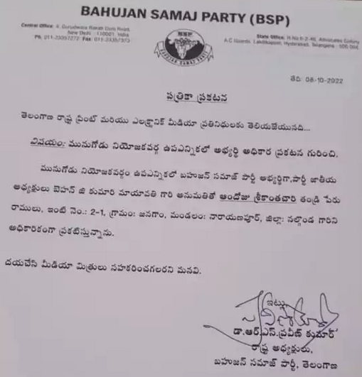 आरएस प्रवीण कुमार ने स्पष्ट किया कि मुनुगोडु में सभी दलों ने रेड्डी समुदाय यानी उच्च जाति के नेताओं को टिकट दिया है। बीएसपी मात्र एससी, एसटी, बीसी और अल्पसंख्यकों के राज्य की शक्ति के लिए काम कर रही है। इसीलिए बीसी उम्मीदवार को टिकट दिया है।