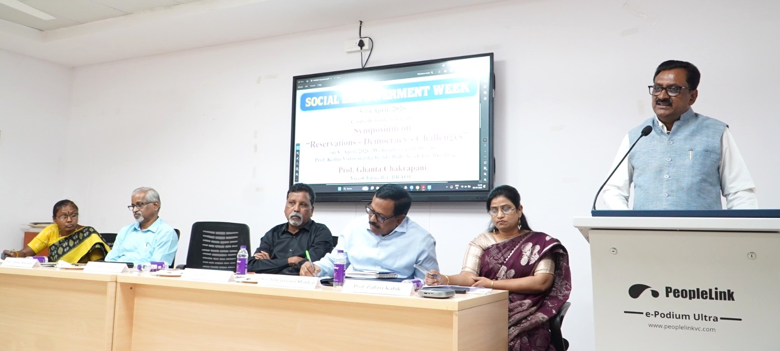 హైదరాబాద్ : సమాజంలో సమానత్వాన్ని నెలకొల్పడంలో రిజర్వేషన్లు కీలక పాత్ర పోషిస్తాయని డా. బి. ఆర్. అంబేద్కర్ సార్వత్రిక విశ్వవిద్యాలయ వైస్ ఛాన్సలర్ ప్రొ. ఘంటా చక్రపాణి పేర్కొన్నారు. “సామాజిక సాధికారత వారోత్సవాల” లో భాగంగా “రిజర్వేషన్లు – ప్రజాస్వామ్యం – సవాళ్లు” అనే అంశంపై బుధవారం సింపోజియం నిర్వహించారు. ఈ కార్యక్రమానికి విశ్వవిద్యాలయ వైస్ ఛాన్సలర్ ప్రొ. ఘంటా చక్రపాణి ముఖ్య అతిథిగా హాజరై ప్రసంగించారు.