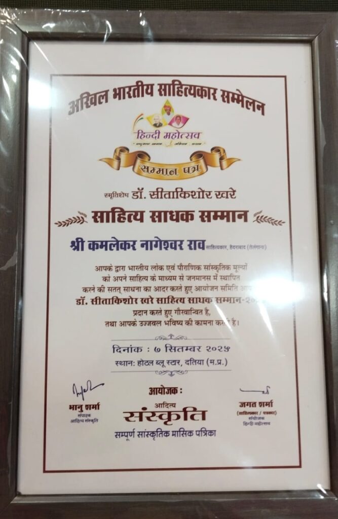 हैदराबाद : अखिल भारतीय साहित्यकार सम्मेलन (दतिया, मध्यप्रदेश) में तेलंगाना के नागर कर्नूल जिले के वेलदंडा मंडल केंद्र स्थित जिला परिषद उच्च विद्यालय के हिंदी शिक्षक कमलेकर नागेश्वर राव ‘कमल’ को उनकी साहित्यिक साधना और काव्य प्रतिभा के लिए डॉ. सीताकिशोर खरे स्मारक साहित्य साधक पुरस्कार से सम्मानित किया गया।