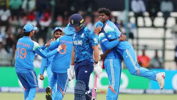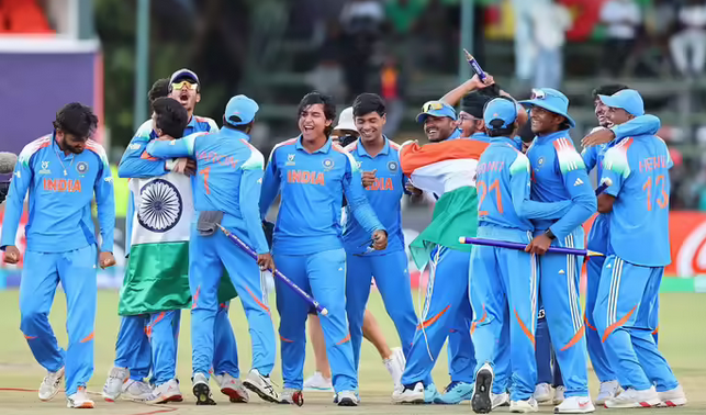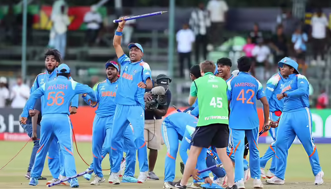 सलामी बल्लेबाज वैभव सूर्यवंशी ने अंडर-19 विश्व कप के फाइनल में ऐतिहासिक पारी खेली। इंग्लैंड के खिलाफ मुकाबले में वैभव ने सिर्फ और सिर्फ 80 गेंदों में 175 बनाये। 14 साल के वैभव ने 15 चौकों के अलावा 15 छक्के भी मारे। कनिष्क चौहान ने कैलेब फॉल्कनर का कैच लिया। इस कैच के साथ ही भारतीय टीम चैंपियन बनी और खिलाड़ी जश्न में डूब गए। भारतीय टीम ने छठी बार अंडर-19 विश्व कप का खिताब जीता है। इससे पहले टीम ने 2000, 2008, 2012, 2018 और 2022 में भी अंडर-19 विश्व कप को अपने नाम किया था।