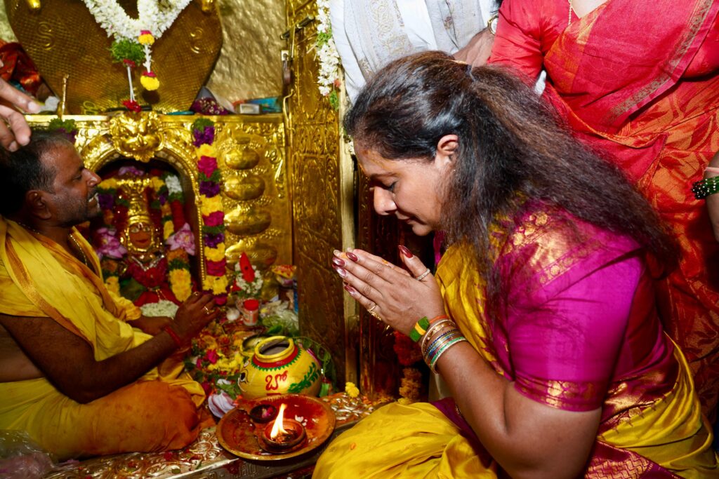 హైదరాబాద్ : గోల్కొండ జగదాంబికా మహంకాళి అమ్మవారికి తెలంగాణ జాగృతి అధ్యక్షురాలు, బీఆర్ఎస్ ఎమ్మెల్సీ కల్వకుంట్ల కవిత బోనం సమర్పించారు. ఆషాఢ మాసం బోనాల ప్రారంభం సందర్భంగా కుమ్మరులతో కలిసి తొలి బోనాల ఉత్సవంలో పాల్గొన్నారు. మహంకాళి అమ్మవారికి ప్రత్యేక పూజలు నిర్వహించారు.