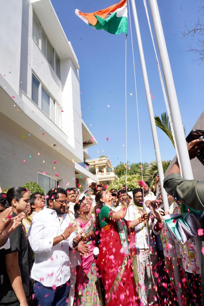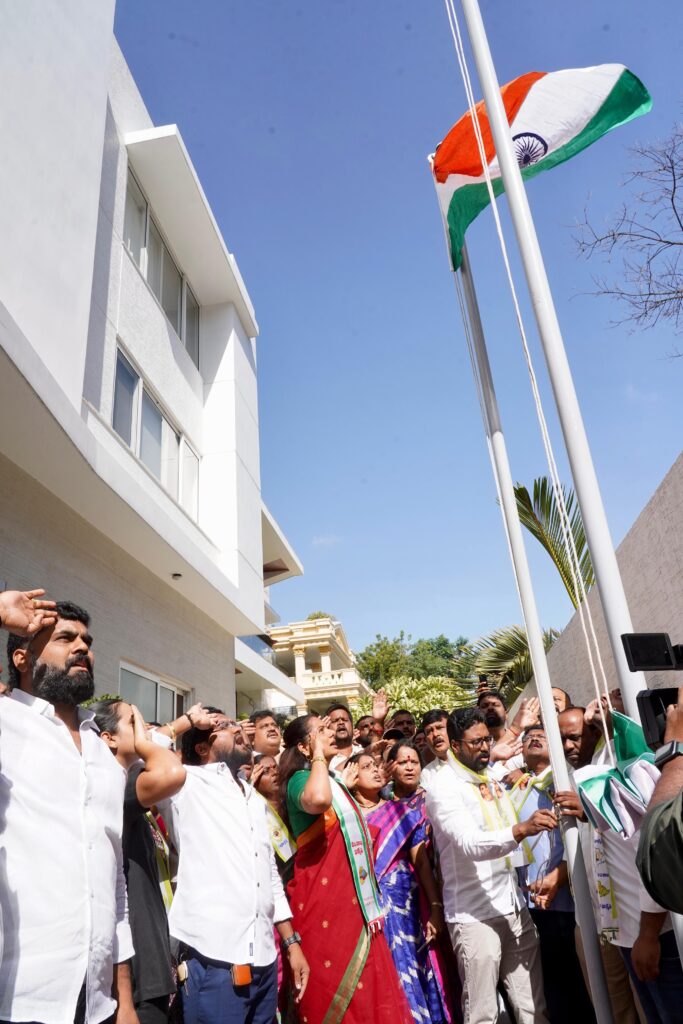 Speaking at the event, MLC Kavitha expressed pride in hoisting the flags for the first time at the new Telangana Jagruthi office.