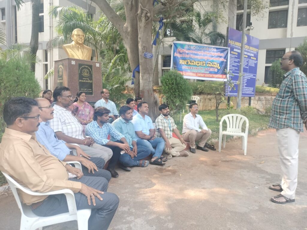 Hyderabad: Representatives of the Dr B R Ambedkar Open University Faculty Teaching Association have urged the government to address the just demands of contract teachers working in universities. The indefinite strike launched by contract assistant professors at Ambedkar Open University, as per the call given by the State Joint Action Committee demanding regularization of contract assistant professors in universities, continued for the sixth day on Saturday.