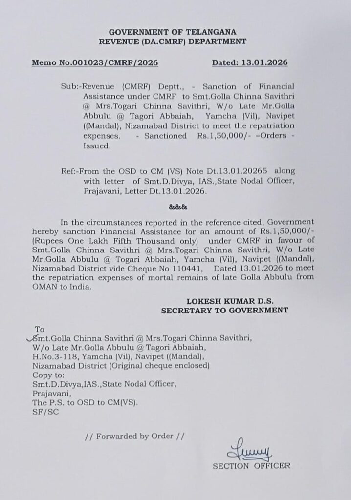 इन हालात में, मृतक की पत्नी तोगरी चिन्ना सावित्री ने अपने बेटे संजय और यामचा गांव के सरपंच बेगारी साई के साथ मंगलवार (13.01.2026) को हैदराबाद में CM प्रवासी प्रजावाणी में मुख्यमंत्री रेवंत रेड्डी के नाम एक अर्जी दी। उन्होंने रिक्वेस्ट की कि उनके पति की बॉडी को घर वापस लाने में होने वाले खर्च को CM रिलीफ फंड से मंज़ूरी दी जाए। उन्होंने 29 दिसंबर को मेल के ज़रिए CMO को एक अर्जी पहले ही भेज दी थी। इसके जवाब में, GAD NRI सेक्शन ने इंडियन एम्बेसी को एक वायर मैसेज भेजा।