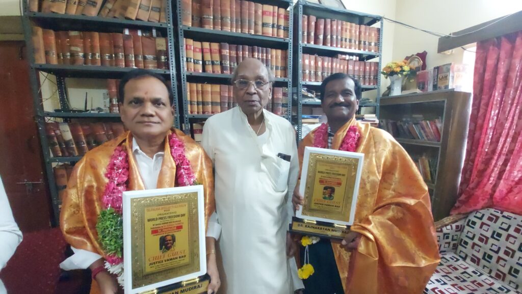 హైదరాబాద్ : సమాజంలోని అన్ని వర్గాల అంశాలను నిష్పక్షపాతంగా సమన్వయం చేస్తూ సమాజ శ్రేయస్సు కోసం ప్రజల్ని చైతన్యవంతులను చేసేందుకు నిరంతరం కృషి చేస్తున్న పత్రికలకు,పాత్రికేయులకు ప్రజలందరూ గుర్తించాలని హైకోర్టు మాజీ న్యాయమూర్తి మరియు ఏపీ ట్రిబనల్ అడ్మినిస్ట్రేటివ్ కోర్టు మాజీ చైర్మన్ జస్టిస్ వామన్ రావు అన్నారు. తెలంగాణ మేధావుల ఫోరం రాష్ట్ర శాఖ ఆధ్వర్యంలో శనివారం బర్కత్పురాలోని ఆయన కార్యాలయంలో ప్రపంచ పత్రిక స్వేచ్ఛ దినోత్సవం పురస్కరించుకొని ఏర్పాటు చేసిన కార్యక్రమంలో ముఖ్యఅతిథిగా పాల్గొని ప్రసంగించారు.