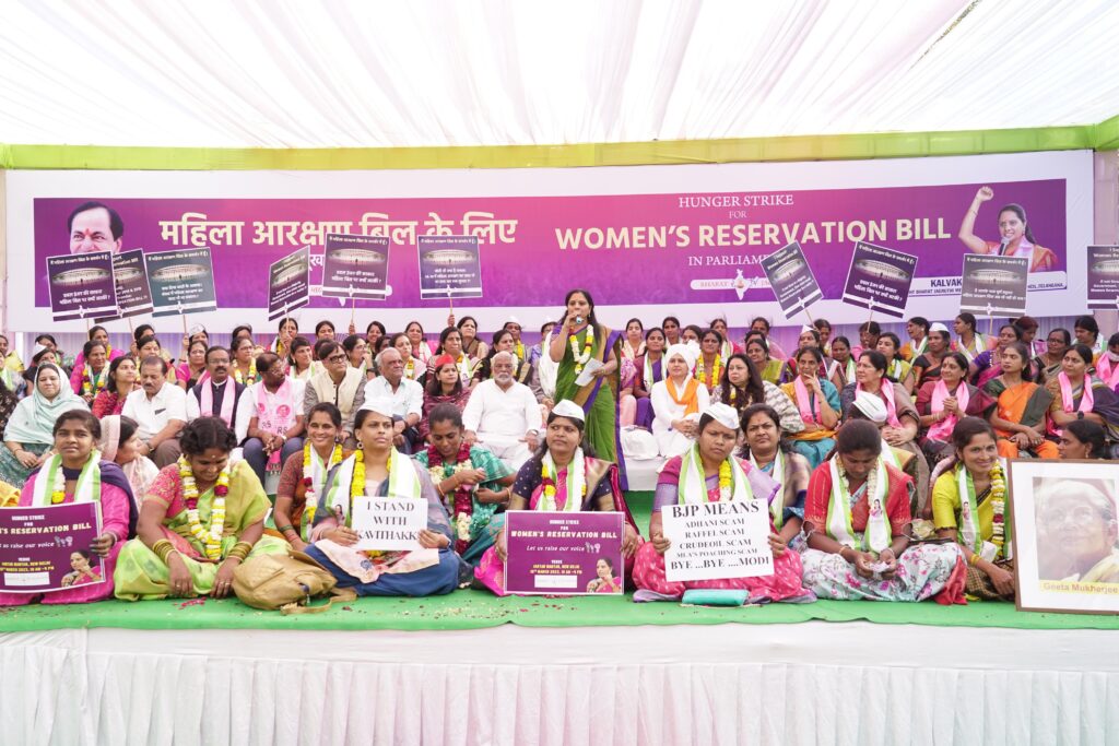 దేశ రాజకీయాల్లో మహిళలకు సముచిత స్థానం కల్పించాలనే లక్ష్యంతో జాగృతి అధ్యక్షురాలుగా తాను, తమ నాయకులు చేసిన పోరాటం ఫలితంగా మహిళ రిజర్వేషన్ల బిల్లుకు ముందడుగు పడిందన్నారు. దేశంలోని 18 రాజకీయ పార్టీలను, మహిళా సంఘాలను, పలు ప్రజా సంఘాలను ఏకం చేసి జంతర్ మంతర్ సాక్షిగా నిరాహార దీక్ష చేశామని గుర్తు చేశారు. మహిళ రిజర్వేషన్ల బిల్లు తెచ్చే విధంగా కేంద్రంపై ఒత్తిడి తెచ్చామన్నారు. రౌండ్ టేబుల్ సమావేశాలు, మేధావులతో చర్చలు, పలు నిరసన కార్యక్రమాల ద్వారా ఈ అంశాన్ని జాతీయ అజెండాగా మార్చగలిగామని తెలిపారు. ఇదే సందర్భంగా ఓబీసీ మహిళ కోటా కేటాయిస్తూ సామాజిక న్యాయం కూడా చేయాలని కోరారమని చెప్పారు. మహిళల కోటాలో ఓబీసీ సబ్ కోటా ప్రస్తావన లేకపోవడం విచారకరమని అన్నారు. కేంద్రం ఓబీసీ కోటాపై స్పందించాలని డిమాండ్ చేశారు.