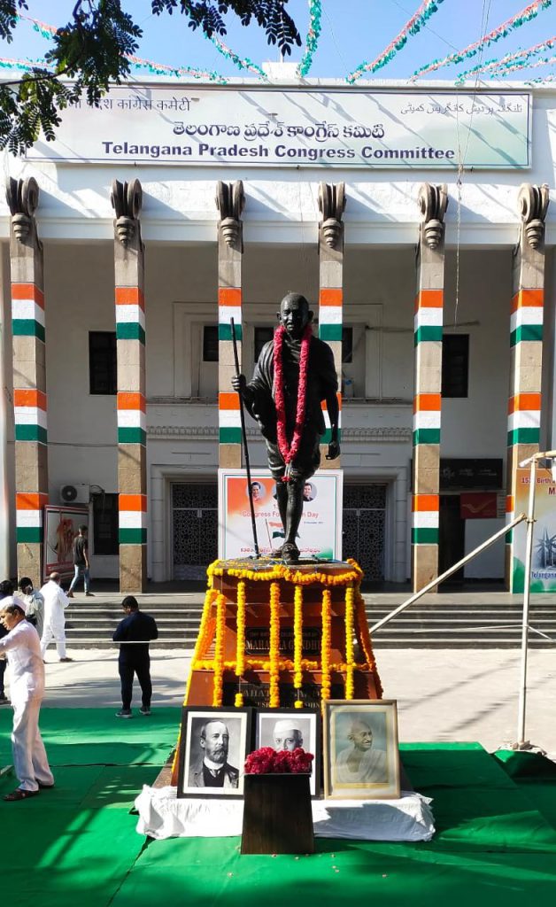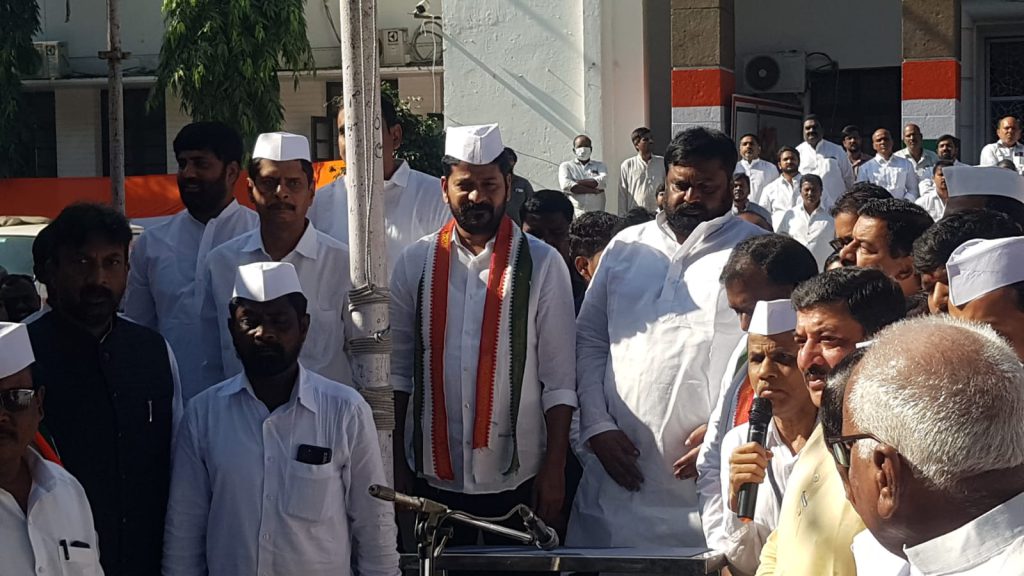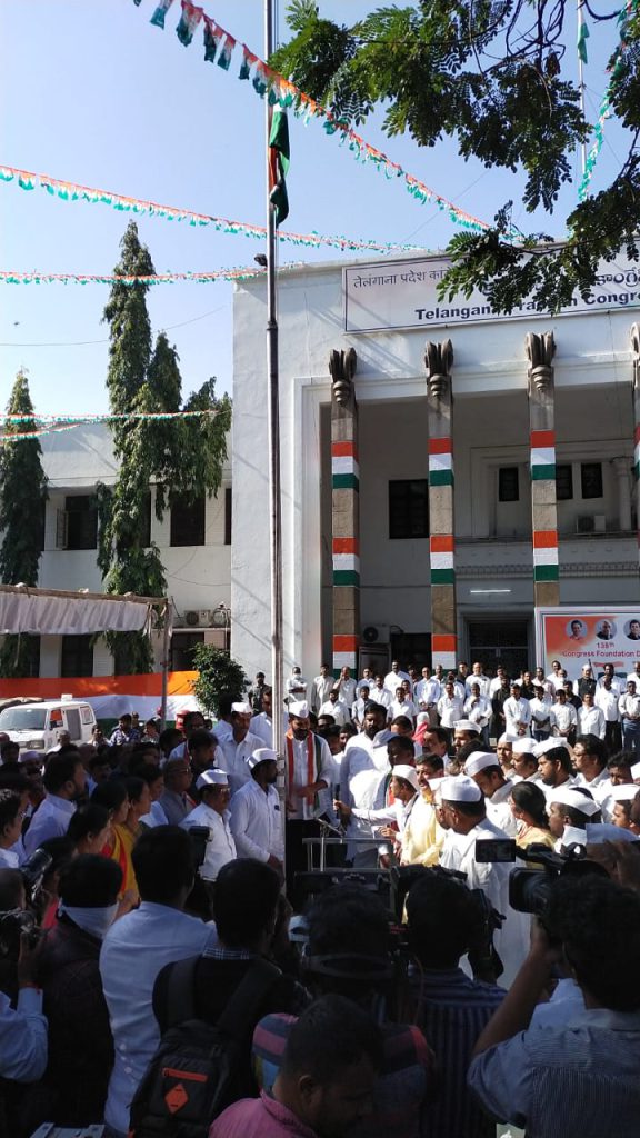 హైదరాబాద్ : భారత జాతీయ కాంగ్రెస్ 138వ ఆవిర్భావ దినోత్సవం గాంధీ భవన్ లో జరిగింది. ఈ కార్యక్రమంలో టీపీసీసీ అధ్యక్షులు రేవంత్ రెడ్డి ఎంపీ పార్టీ జెండా ను ఎగురవేశారు. పార్టీ వ్యవస్థాపకులు హ్యూమ్, జాతిపిత మహాత్మాగాంధీ, జవహర్ లాల్ నెహ్రూ చిత్రపటాలకు పూలు చల్లి నివాళులు అర్పించిన కాంగ్రెస్ అధ్యక్షులు రేవంత్ రెడ్డి మరియు సీనియర్ నాయకులు.